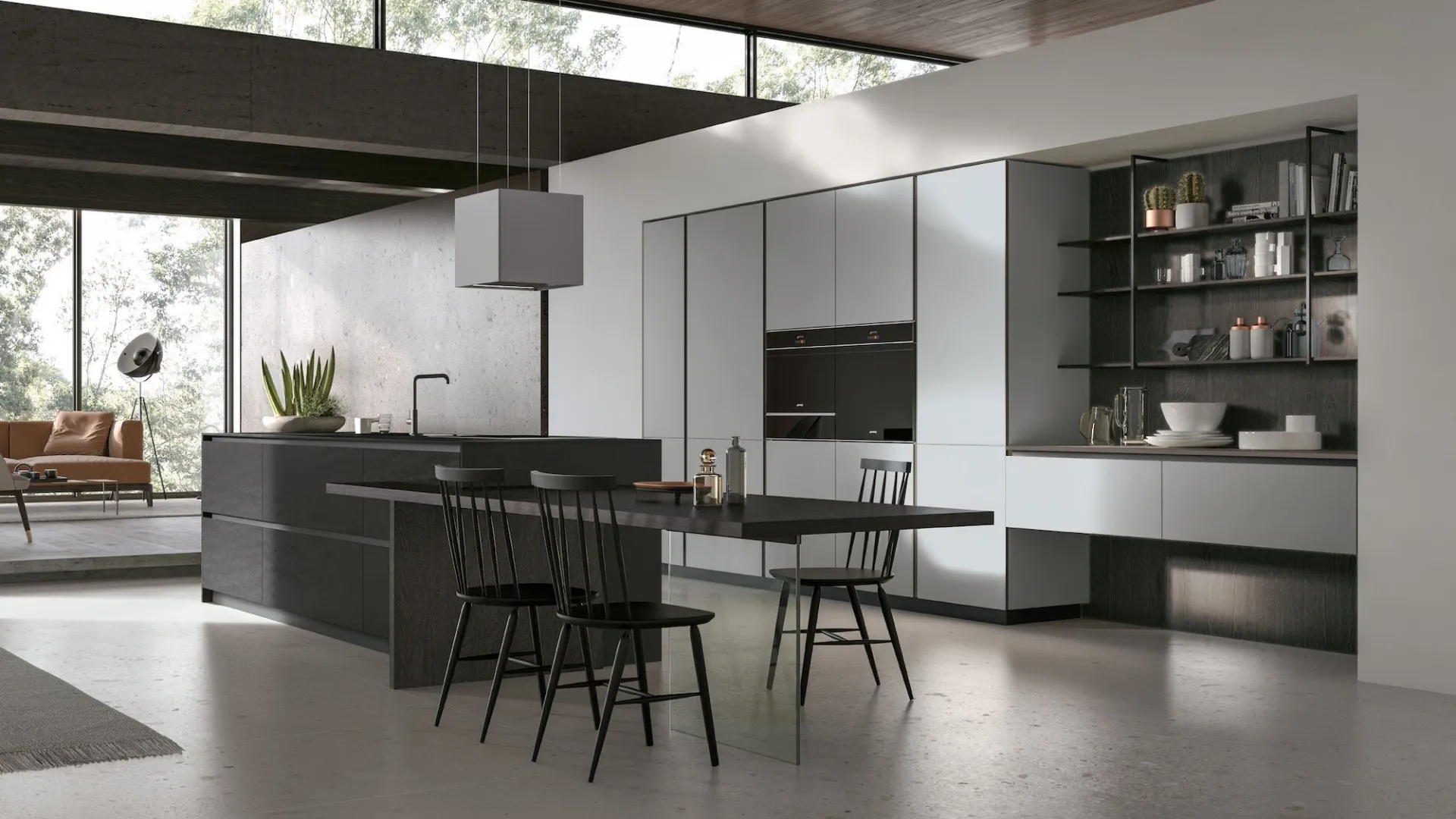 Isole Neolith® Shilin Slate, Snack top Rovere Conero, colonne Termocotto Onda